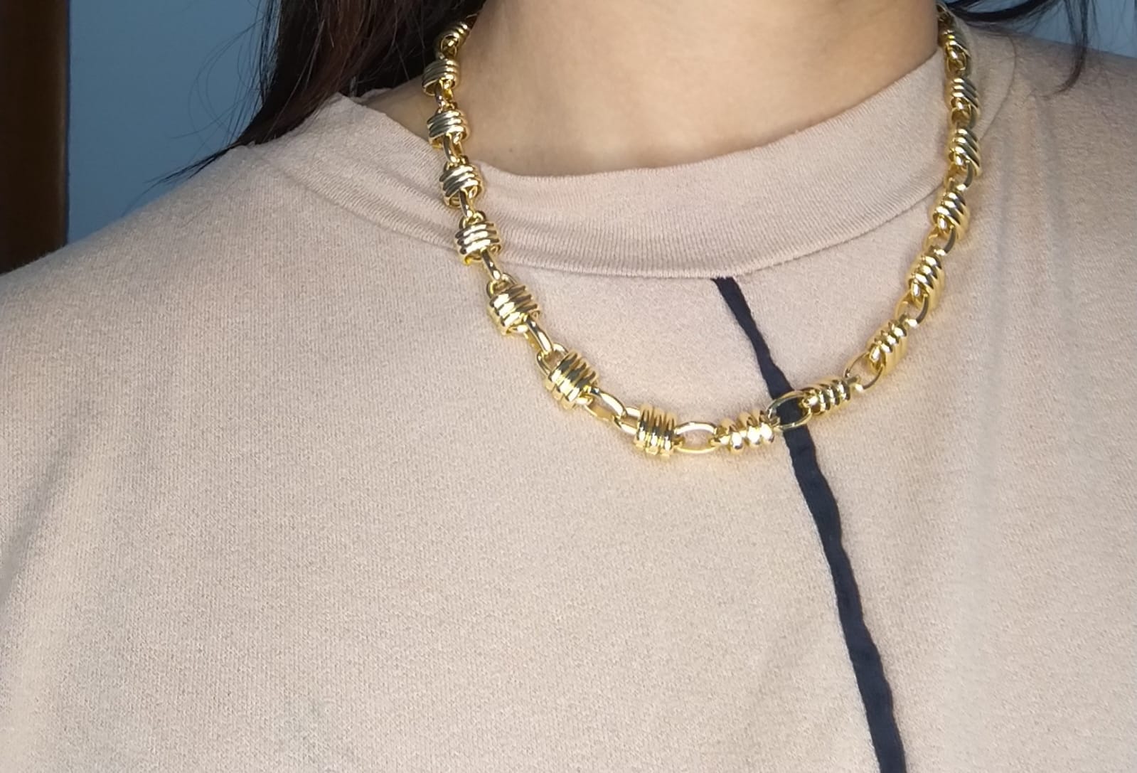 Colar banhado a ouro em elos ondulados. Esse colar mistura sofisticação e modernidade deixando o look elegante.
