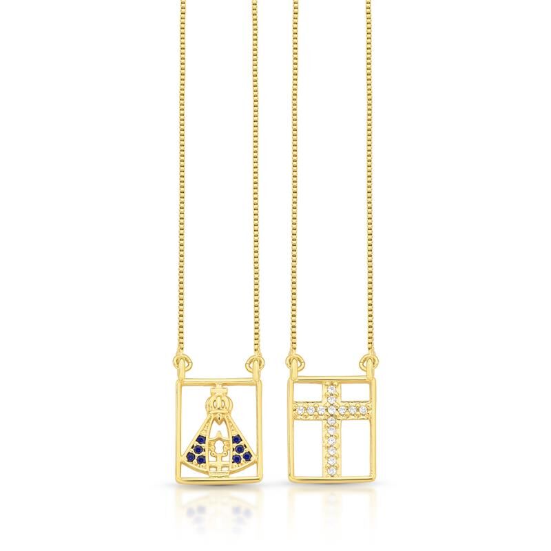 Escapulário banhado a ouro, com zircônia retangular e imagem vazada da cruz e de Nossa Senhora Aparecida. Um acessório simbólico e sofisticado em malha veneziana, perfeito para expressar fé e elegância em qualquer composição.
