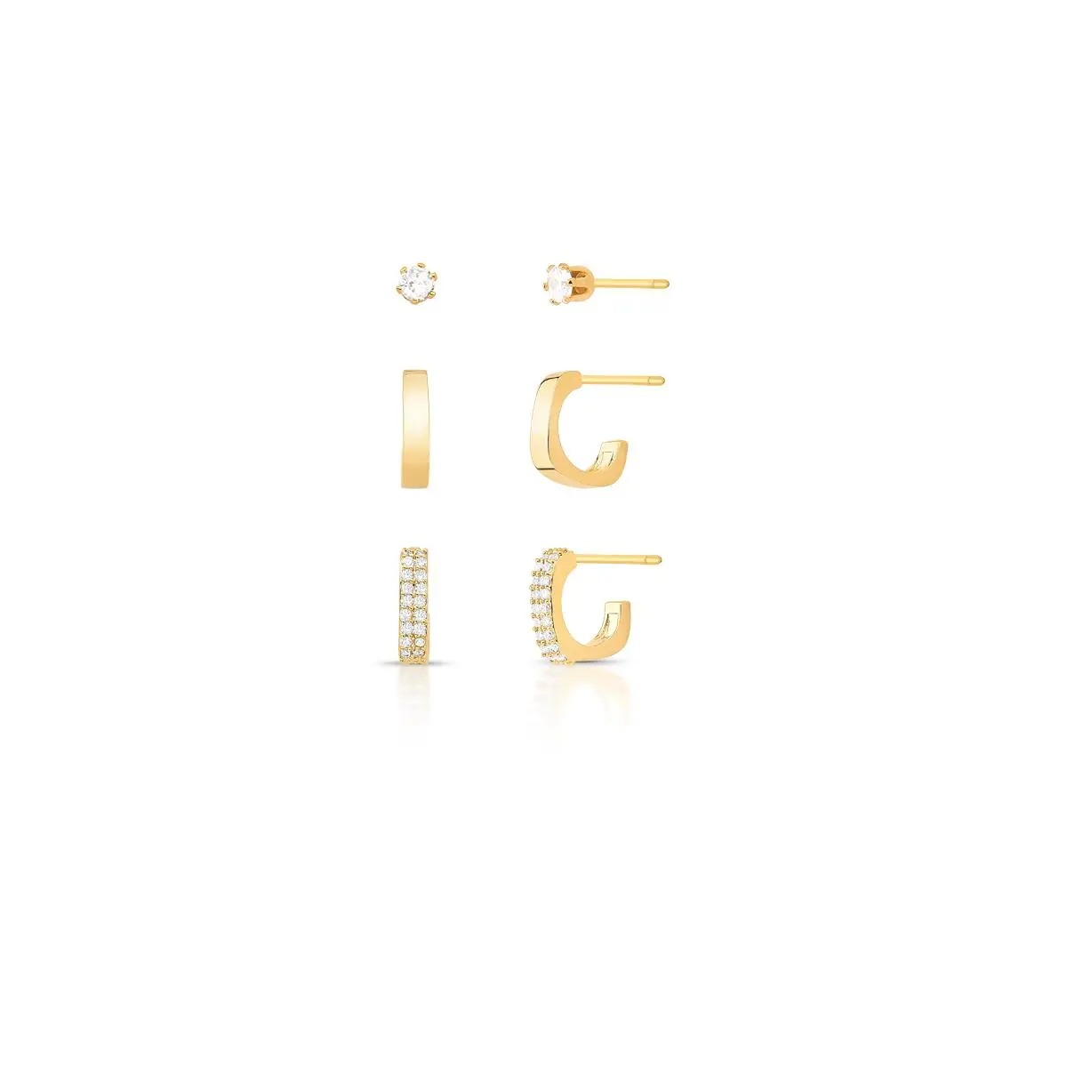 Trio banhado a ouro composto por meia argolas com zircônias e cristais redondos, ideal para quem busca estilo e brilho em diferentes combinações. Peças versáteis que valorizam qualquer look com sofisticação.